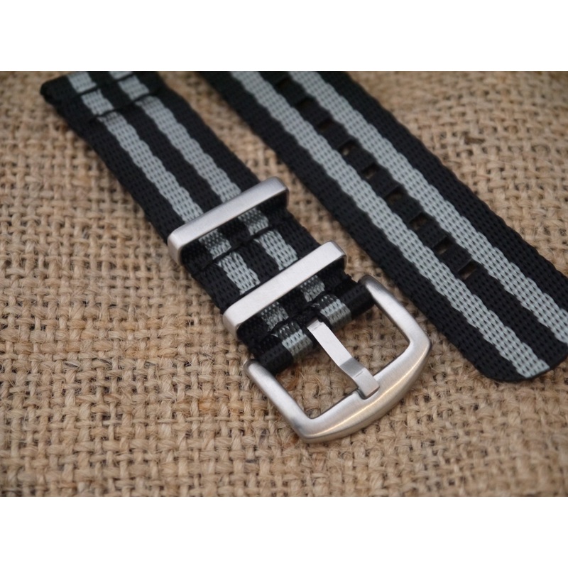 Our 2-piece NATO watch strap in James Bond design (black with grey lines).Made from high tensile strengthnylon webbing with luxury hardware, including a premium stainless steel buckle and rectangular stainless steel keepers. Our nylon is heavy weaved forasoft feel (yet strong!!) with a highersheen than standard NATO straps. Our premiumstrap that rivals the big boys in quality.