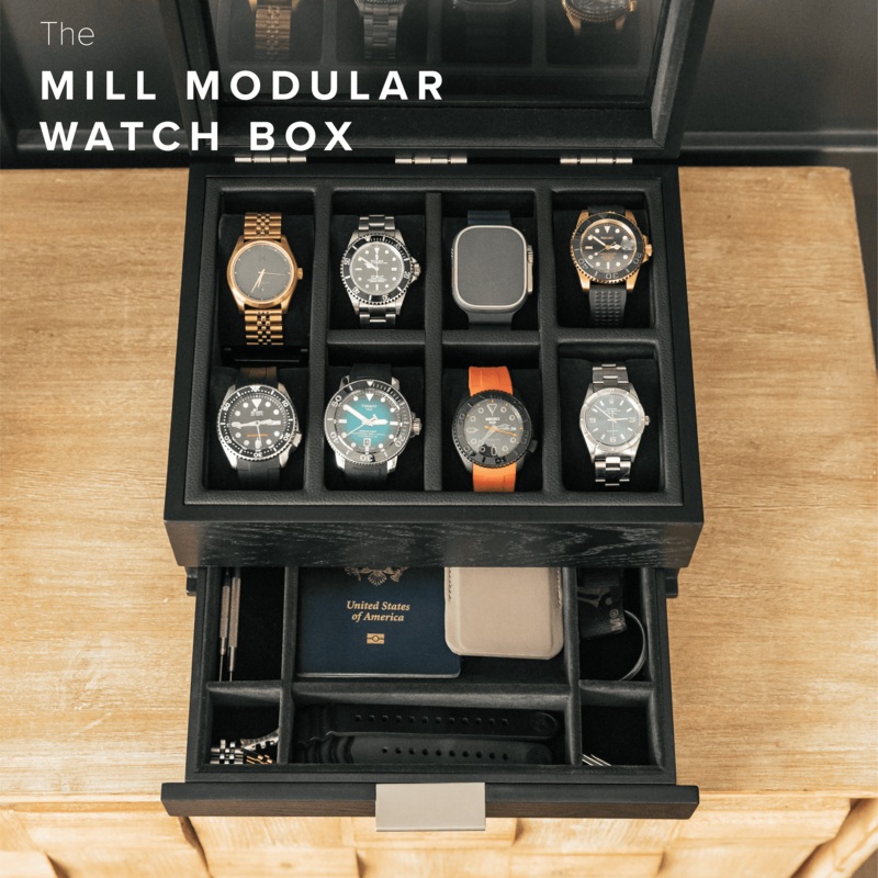 Proudly display your watches with the Mill Watch Box by Case Elegance, a handsome glass-top display case perfect for your collection of watches and accessories. This black ash-wood box features removable interior walls for unique modular storage. The Mill can hold 8 large-face watches or convert into a 2-slot setup by simply removing the middle walls to accommodate sunglasses and other accessories like your apple watch or phone. The interior is lined with resilient scratch-proof, soft black velvet for ultimate protection and durable vegan leather dividers to keep your watches safe and secure. Show your watches off properly on individual cushionedatop our custom-designed pillow stands that ensure your watches are perfectly aligned. Weve included a pull-out accessory drawer ideal for storing extra watch bands, accessories, and tools. With the ability to customize your setup with smartwatch charging and sunglass storage, this watch box is the ideal all-in-one setup for your watch collection.