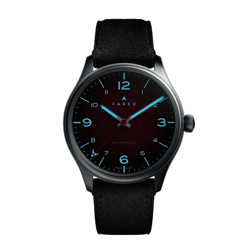 Three hand automatic watch with a red textured dial coated with a clear polished lacquer.