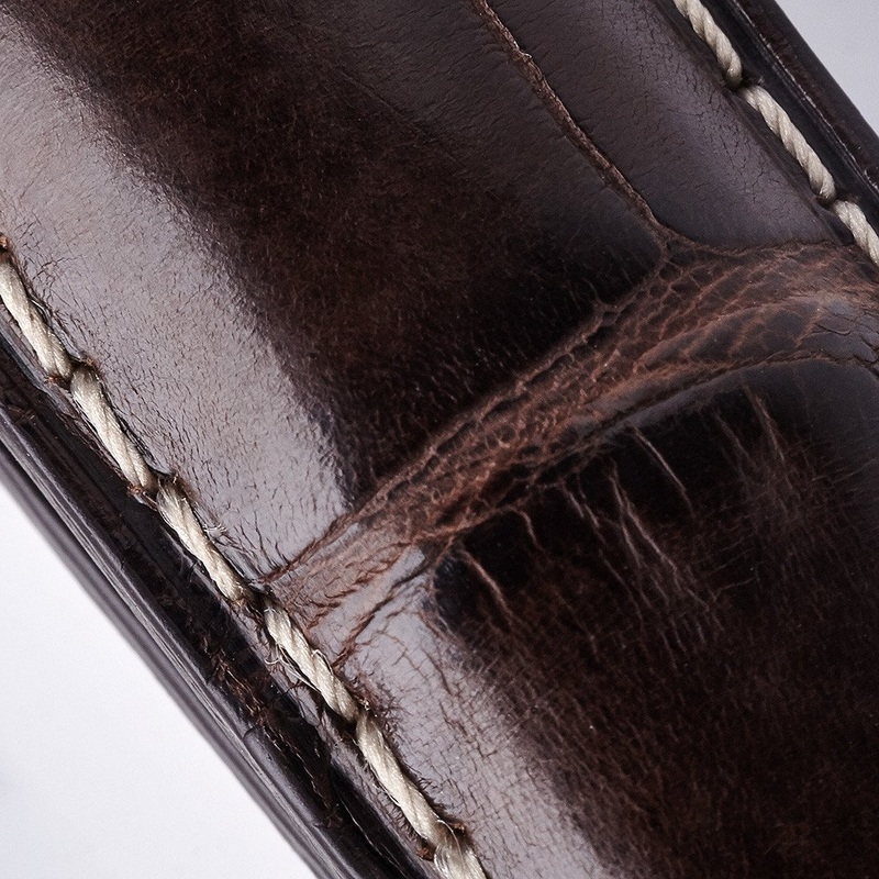 Brown genuine alligator leather Wright Flyer strap with white stitching and embossed Wright Brothers Family Foundation logo.
