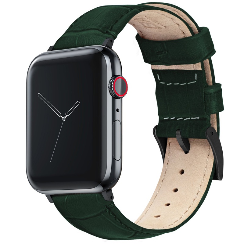 These forest green Alligator Grain Leather watch bands will take any Apple Watch to the next level. These straps are designed with a 2mm taper from watch head to buckle and are padded for style and comfort. Crafted from hand-selected top grain leather and embossed with premium alligator texture, these Apple Watch bands mean business.