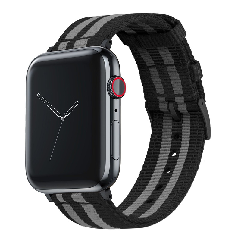Our Two-piece NATO style Apple Watch bands are sure to add character and comfort to any Apple Watch. Our nylon straps are water-resistant, colorfast, and feature two nylon keeper loops for a more comfortable fit. Please be aware that due to the sturdy dual-layer construction, our two-piece NATO style straps do have a stiffer feel that softens up over time.