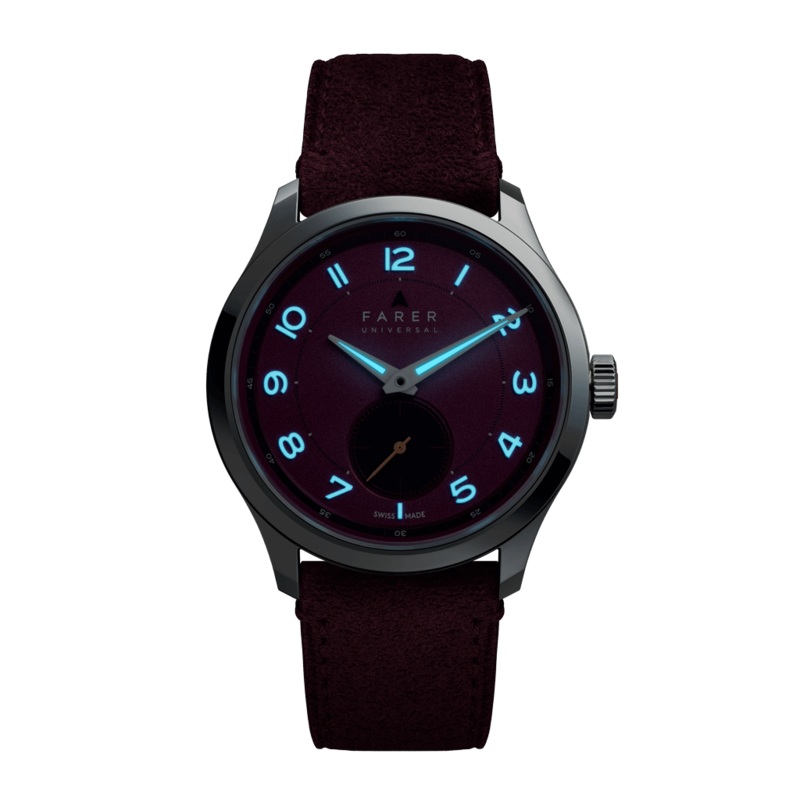 Slimline 38mm watch with textured raspberry dial and contrast purple sub dial.