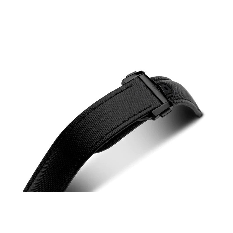 Ideal for Artem’s Loop-Less sailcloth-style watch strap, the Loop-Less deployant clasp has been designed with the discerning watch enthusiast in mind. Every aspect of this buckle has been selected with care, from the heft on down to the secure closing mechanism. Double pusher buttons enable effortless functionality, while the subtle curvature creates optimal conformity on the wrist. Shown here in premium 316L stainless steel with a flawless black DLC (diamond-like carbon) finish.
