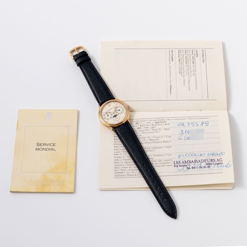 The porcelain dial features an applied AP logo at 12 o’clock, two subdials for the day and date functions (in English), a moon phase display at the six o’clock position, and fine, non-lumed hour markers, complemented by slim, non-lumed hour and minute hands. In essence it’s the dressier brother of the legendary AP Royal-Oak 25594, featuring the same movement. The watch is fitted with a lovely Bulang & Sons leather strap and an original AP 18k gold pin buckle.