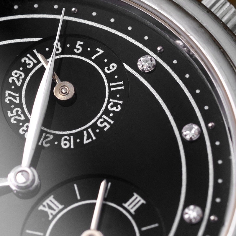 – Black diamond dial with second time zone, date and power reserve