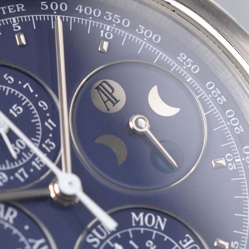 This example remains in outstanding original condition with a good case and fantastic overall aesthetics., weighing a hefty 250 gram !The 40 mm case has 4 setting pushers on the side and two pushers for the chronograph function. The watch has a lovely rich blue dial with tachymeter scale, serif AP font and thin polished non luminous hands for minutes and hours and polished and white painted hands for calendar and chronograph function. The two different complications are integrated in the sunken sub dials. The counters at 6, 9, and 12 oclock positions display the day, month, leap year, and date functions plus the chronograph function. The moon phase indicator is at 3 o clock. The watch is fitted with the original platinum braclet that will fit a wrist size up to 18cm. The watch houses the automatic calibre 2226 /2839 based on a Jaeger-LeCoultre ebauche and Dubois Depraz module that has been fully checked and regulated by our watchmaker. The watch is accompanied by a digital extract from the archive stating a registration date of May 1995 , as well an big an big AP watch winder With the outer box that has some wear.