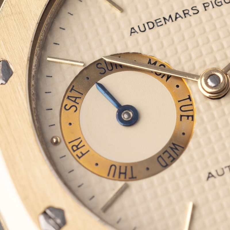The cream petit tapisserie dial is really beautiful and balanced with days, in English, on the left and date on the right in yellow gold-rimmed sub dials and small AUDEMARS PIGUET text.