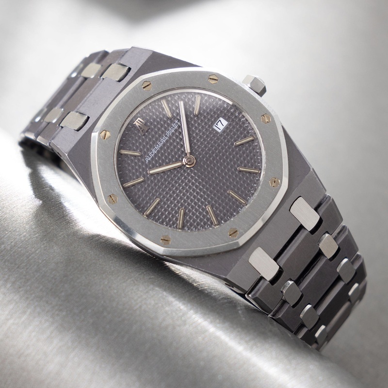 The 33mm is in great condition with strong lines, in fact we believe this watch is unpolished ! The Stern-made grey petit tapisserie dial is in great condition with the small , old style AP signature in the top half of the dial and a date at three.