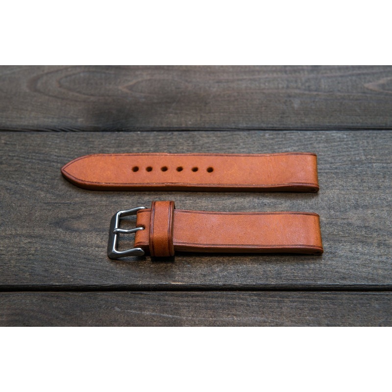 The strap is made with vegetable tanned leather, that is full grain, has a nice supple feel and slightly firm.