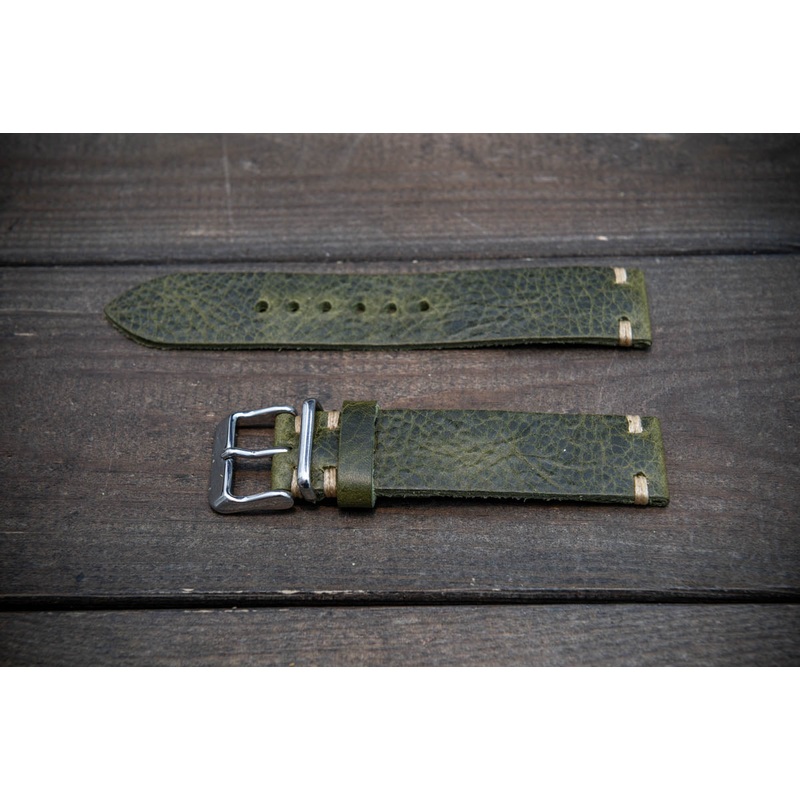 The watch strap is made of the finest Badalassi Carlo leather from Italy. The watch strap has a unique rustic look and deep color. The leather gets beautiful patina with the time. Color: Oliva, pull-up.