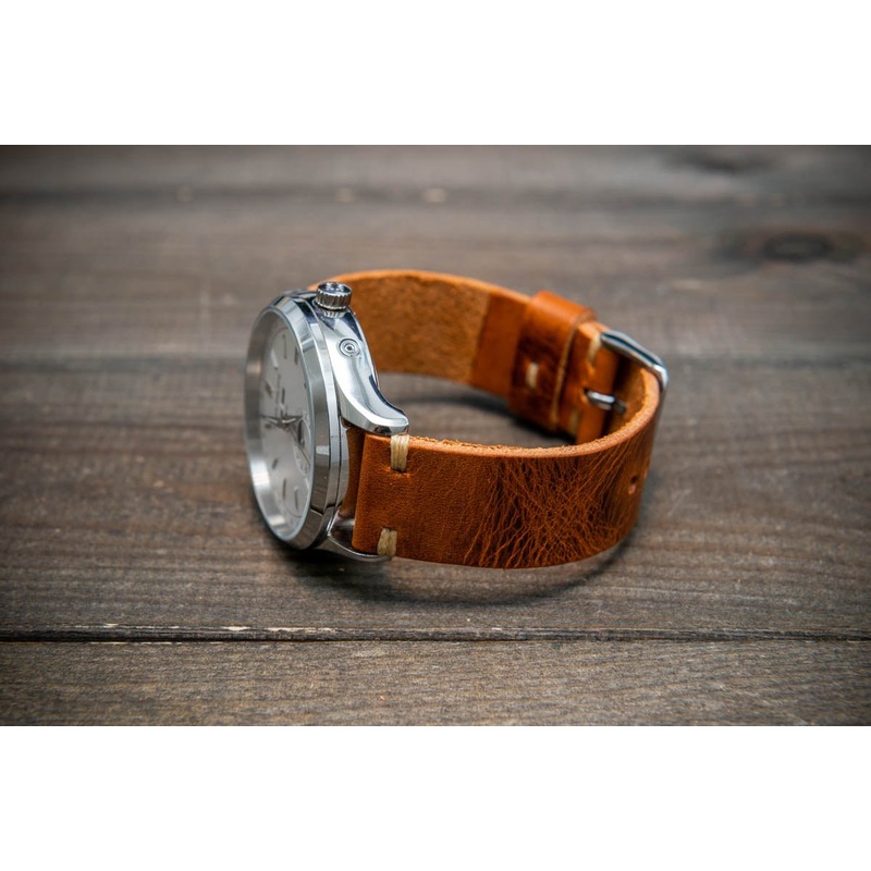 The watch strap is made of the finest Badalassi Carlo leather from Italy. The watch strap has a unique rustic look and deep color. The leather gets beautiful patina with the time. Color: rich pull-up of dark and light brown shades.
