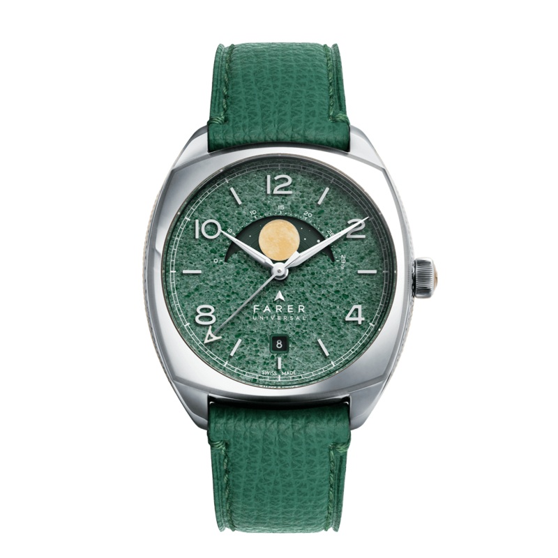 Hand-wound moonphase watch with an authentic aventurine dial and choice of strap.