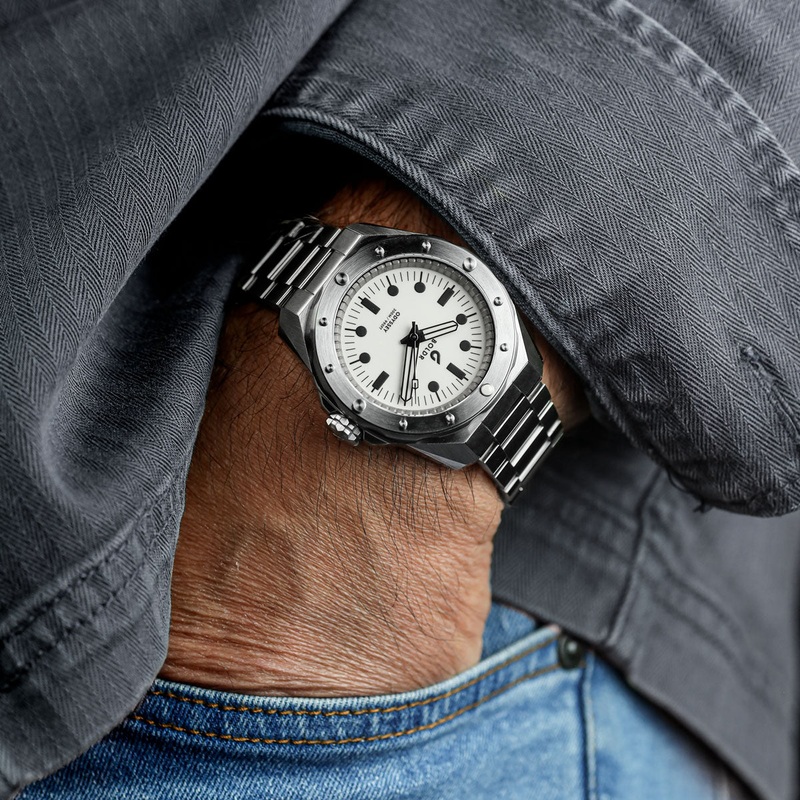A 120-click unidirectional bezel frames the dial, fitted with rivets inspired by vintage dive helmets. A lume pip sits at 12 oclock for fast orientation when the pressures on.