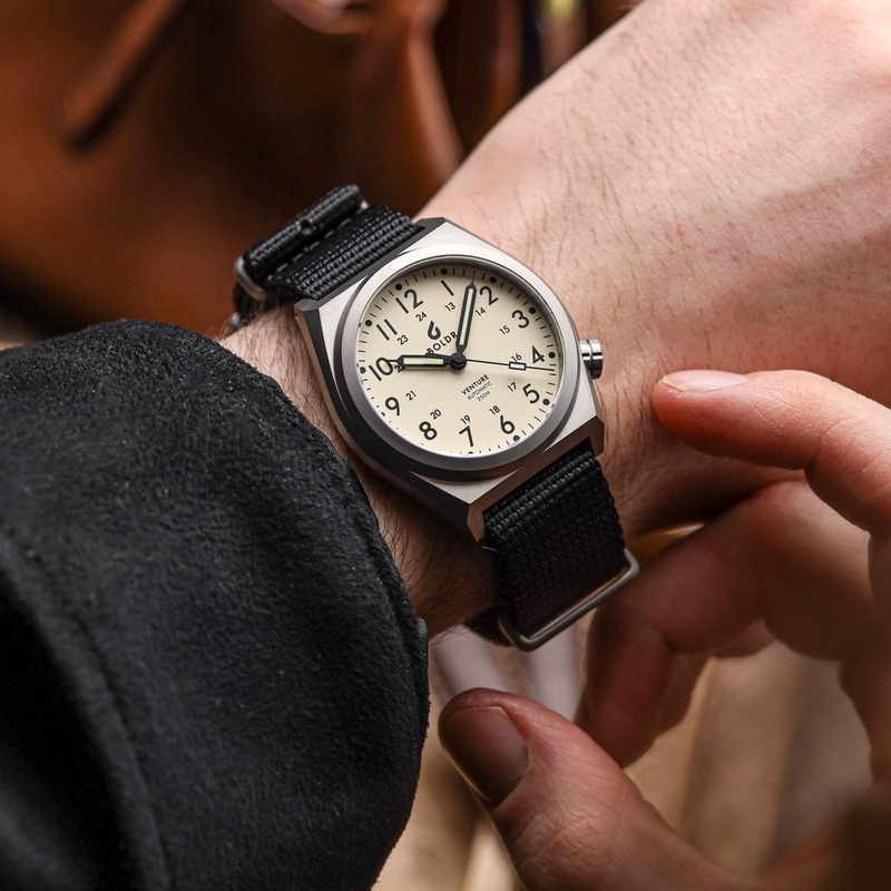 • The sleek, angular case is unique to Boldr and sets the Venture apart from other field watches.