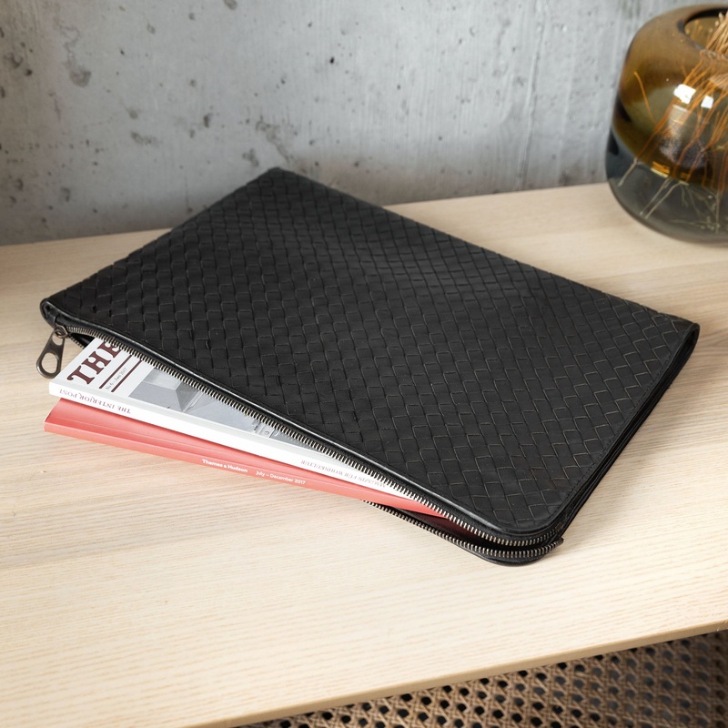 .This multifunctional document case is sure to turn heads when you bring into a meeting. Crafted with a minimalist approach from supple blue Intrecciato VN calf leather, the bag is sized for up to a 13″ Mac Book, documents or a notepad. The expertly constructed top zipper grants access to the canvas lined interior plus a padded snap-button pocket.