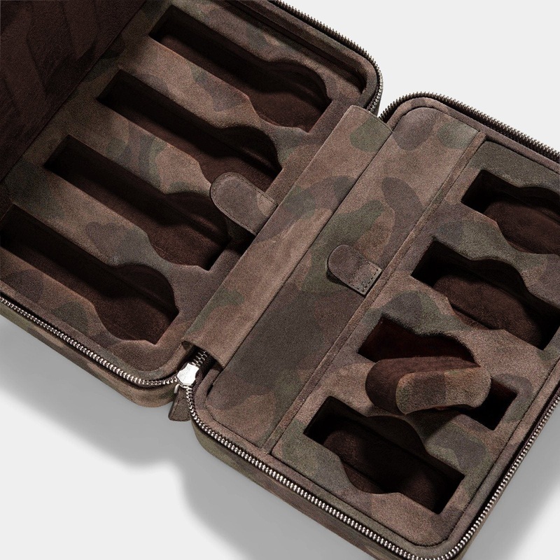 Supple, naturally tanned brown camouflage and brown alcantara. Holds up to eight watches with a case diameter of up to approx. 46mm incl. crown.