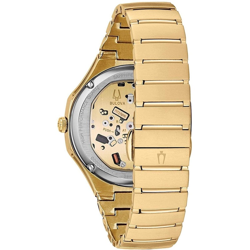 Elevate Your Style with the Bulova Men’s CURV High Performance Quartz Stainless Steel Watch, 5-Hand Chronograph, Sapphire Crystal, Luminous Hands, Gold-Tone/Black Dial