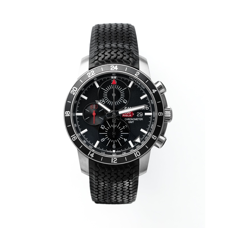The Chopard Mille Miglia 8550 with a black dial embodies the perfect balance between vintage motorsport heritage and contemporary elegance. The 39mm stainless steel case houses a striking black dial adorned with bold Arabic numerals, luminous hands, and chronograph subdials that provide precision timing. A tachymeter scale along the outer rim enhances the racing-inspired design, allowing for speed calculations over distance a subtle nod to the legendary Mille Miglia race.