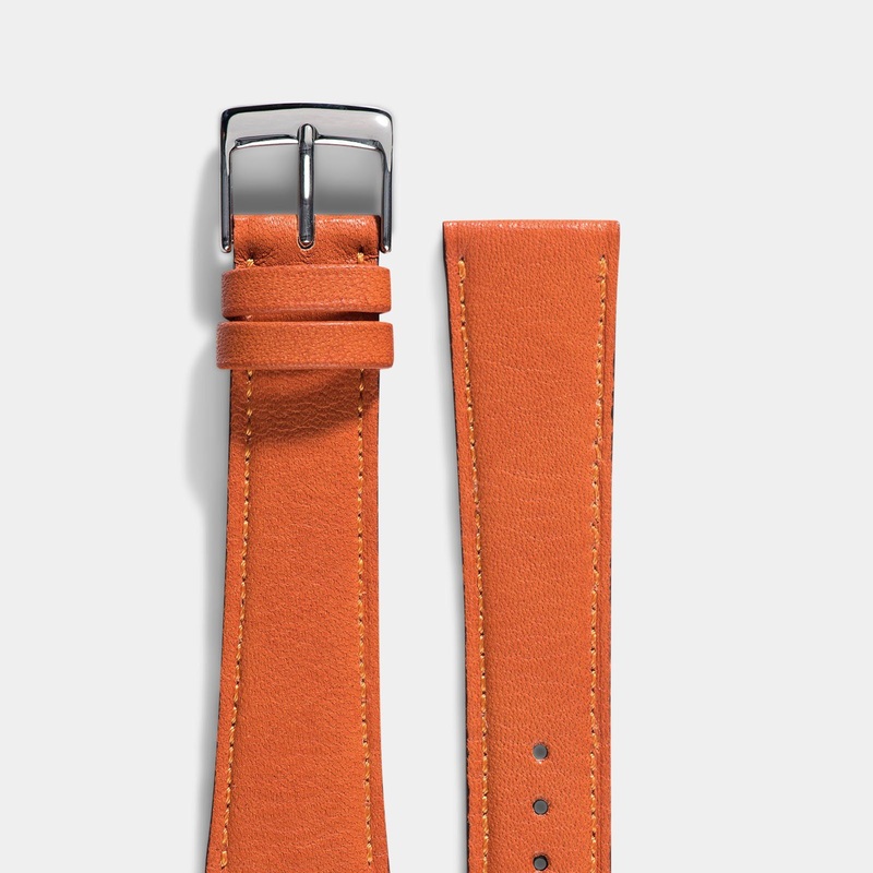 With a special tapered cut and blackened edges, this orangeleather watch strap provides a modern yet timeless and easy approach for your wrist.