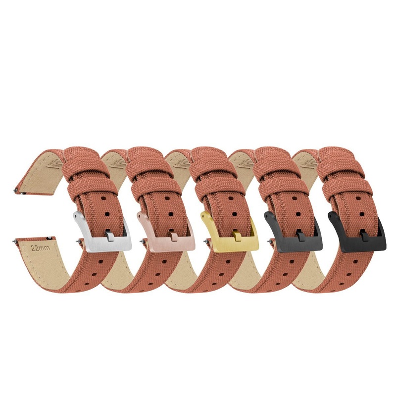 Our copper orange Sailcloth Quick Release watch band features a premium nylon weave with smooth leather backing. Each band is designed with padding for comfort and durability, a 316L surgical grade brushed stainless steel buckle, and a 2mm taper from watch head to buckle. Swap out in just a few seconds and without tools! Pair this sailcloth watch band with our Leather, Elite Silicone or Canvas quick release bands to take full advantage of the opportunity to ‘Switch it Up’ on the go.