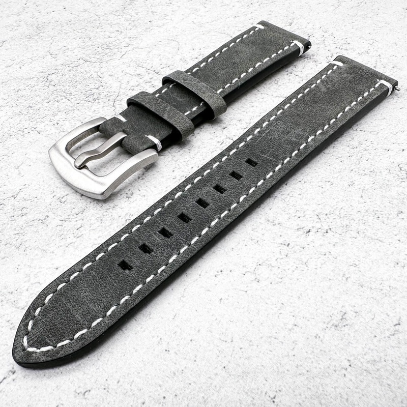 Rustic. Charming. Rugged. Elevate your timepiece with the timeless appeal of our Grey ‘Crazy Horse’ leather watch strap. This full-grain masterpiece develops a unique patina over time, reflecting your adventures and personality. Its supple yet robust nature ensures both comfort and confidence, making it the perfect partner for everyday wear and weekend escapades.