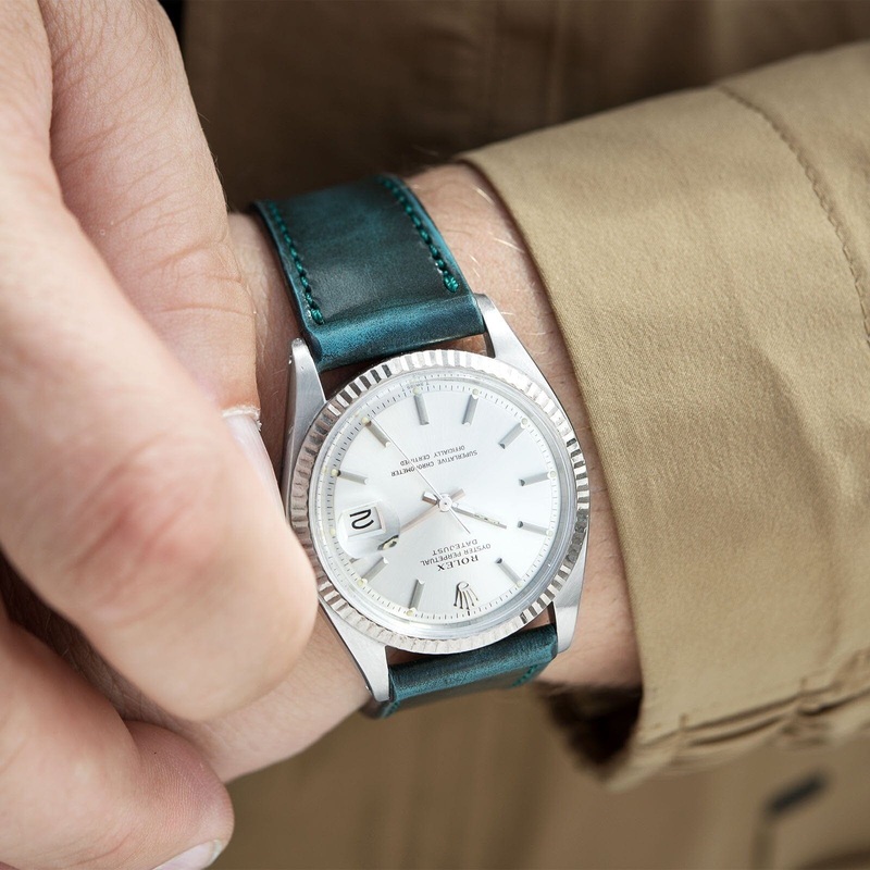 This leather appears magic green, just like Verdigris, the pigment that colours copper green. Another term for it is patina and this watch strap made from highly exclusive Italian leather has lots of it.