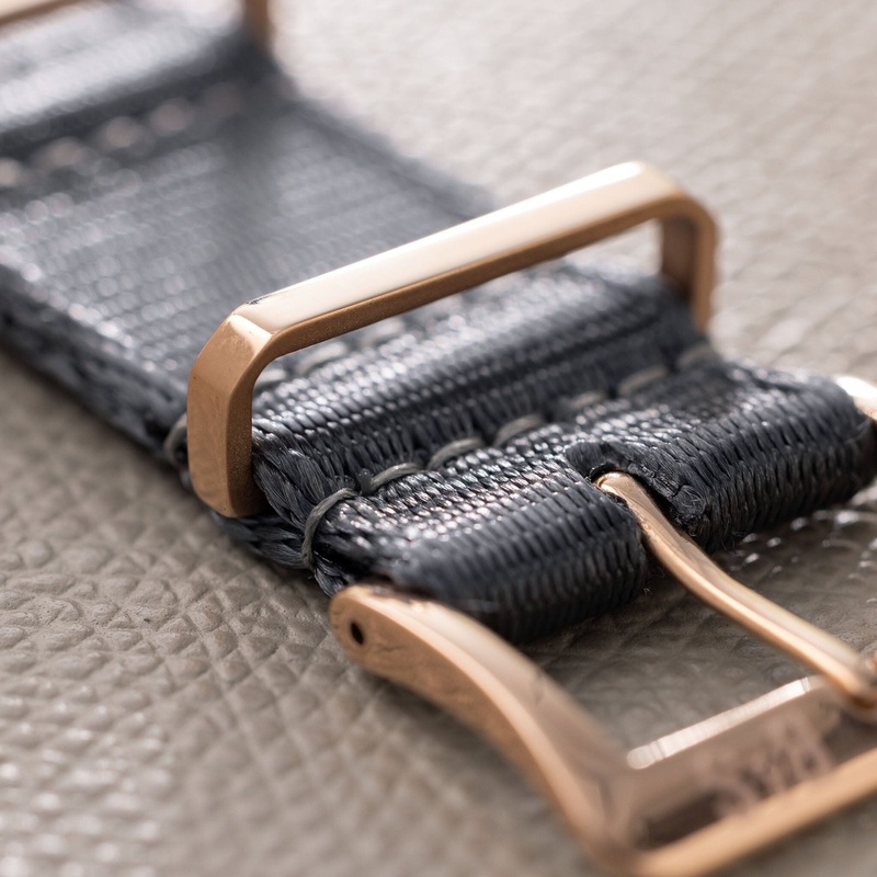 This grey version features a silvery stitching as well as the special rose gold color plated metal keepers and laser-etched Bulang and Sons buckle.