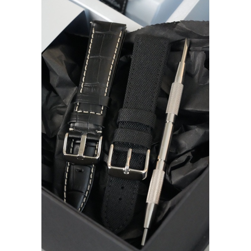 A sleek all-black leather strap with white contrast stitching and polished silver buckle. Perfect for elevating the EarthPhase with a subtle formal edge.