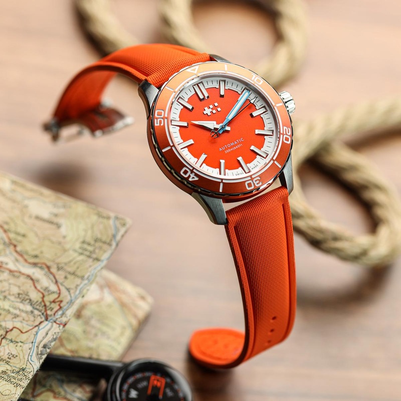 Crafted from premium FKM rubber, this strap shrugs off UV, saltwater, and extreme temperatures, making it an ideal pairing for dive watches and tool watches alike. Its distinctive sailcloth-style texture, achieved through precise moulding, adds depth and sophistication, nodding to vintage military straps while maintaining a modern, technical edge.