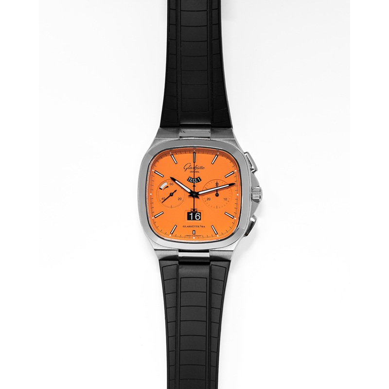 Powered by the automatic Caliber 37-02 movement, it offers a 70-hour power reserve and includes a flyback function for seamless timekeeping. The transparent sapphire crystal case back provides a glimpse of the meticulously finished movement, showcasing Glashttes renowned craftsmanship. Water-resistant up to 100 meters, this vibrant timepiece is paired with a sleek stainless steel bracelet, making the Seventies Chronograph Panorama Date with an orange dial a perfect statement piece for watch enthusiasts who appreciate bold design and technical excellence.