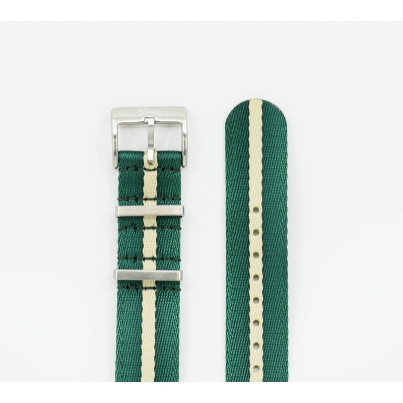 Our green and gold strap is made from premium grade “seatbelt” nylon, with high qualitybrushedsteel hardware, engraved with our “Mushi” logo on the buckle