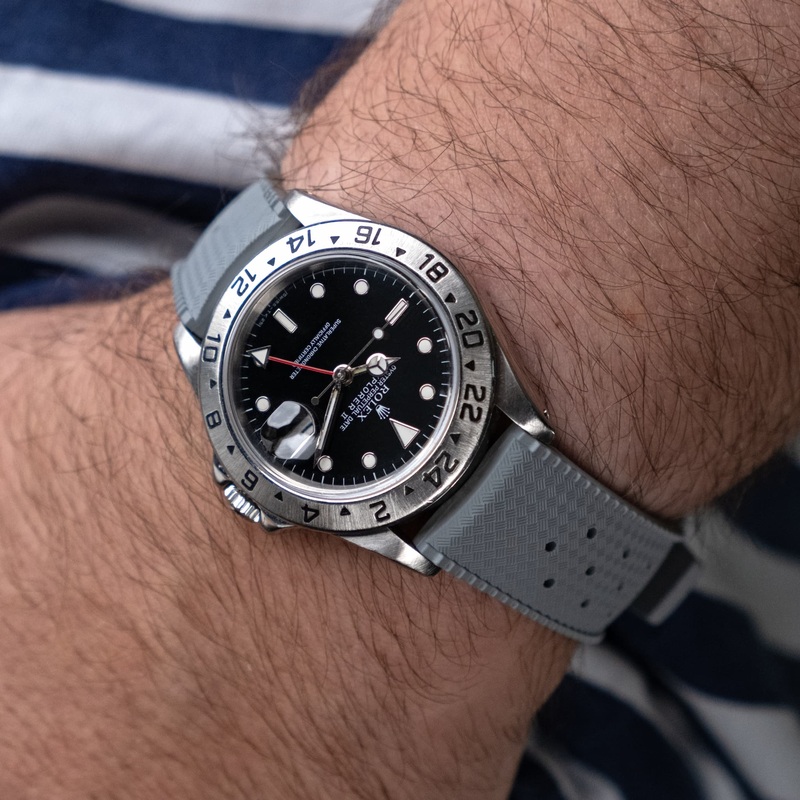 Inspired by the golden era of 1960s dive watches, our Tropical Rubber Strap brings vintage character into the modern age. With its perforated design and signature crosshatch texture, this strap echoes the look of original tropic straps worn by skin divers, but is built from high quality FKM rubber for todays demands.