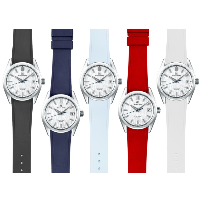 22mm integrated vulcanized FKM rubber strap for the Grand Seiko Evolution 9 case for when you want to keep it casual and comfortable with quick release spring bars. The underside of the strap features a design inspired by the topography map of Mt. Iwate, and tapers to 18mm at the buckle.