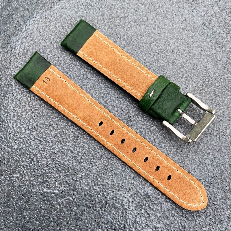 Samurai Vintage Co. green handcraft Frenchcalfskin leather watch strap is compatible with many watches with standard 18mm/20mm/22mm lug width. It is handmade crafts and use the highest quality leather to guarantee highly comfortable wear around your wrist. The back is made of calf leather with anti-allergic coating. This strap will come with stainless steel tang buckle.