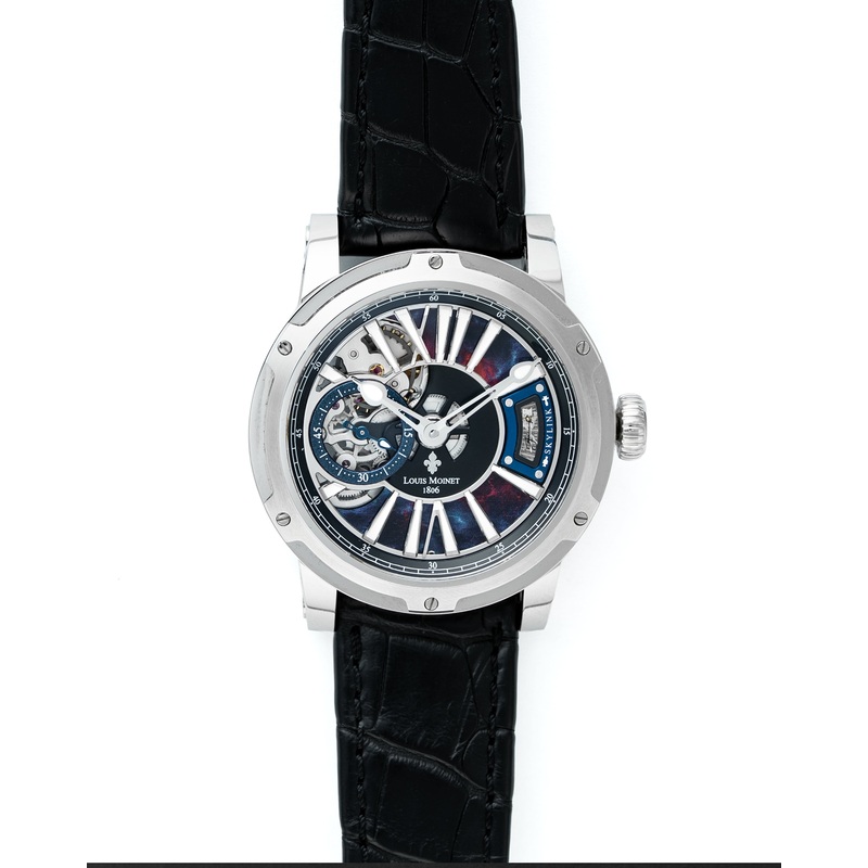 Encased in stainless steel with a 43.2mm diameter, the Metropolis Skylink boasts a striking open-worked dial, offering a glimpse of its intricate mechanical movement. The blue and silver color scheme is reminiscent of Earth’s horizon seen from space, while the automatic movement ensures precision and reliability. The exclusive Louis Moinet case design, with its signature six-screw bezel, adds to the futuristic aesthetic and luxurious feel.
