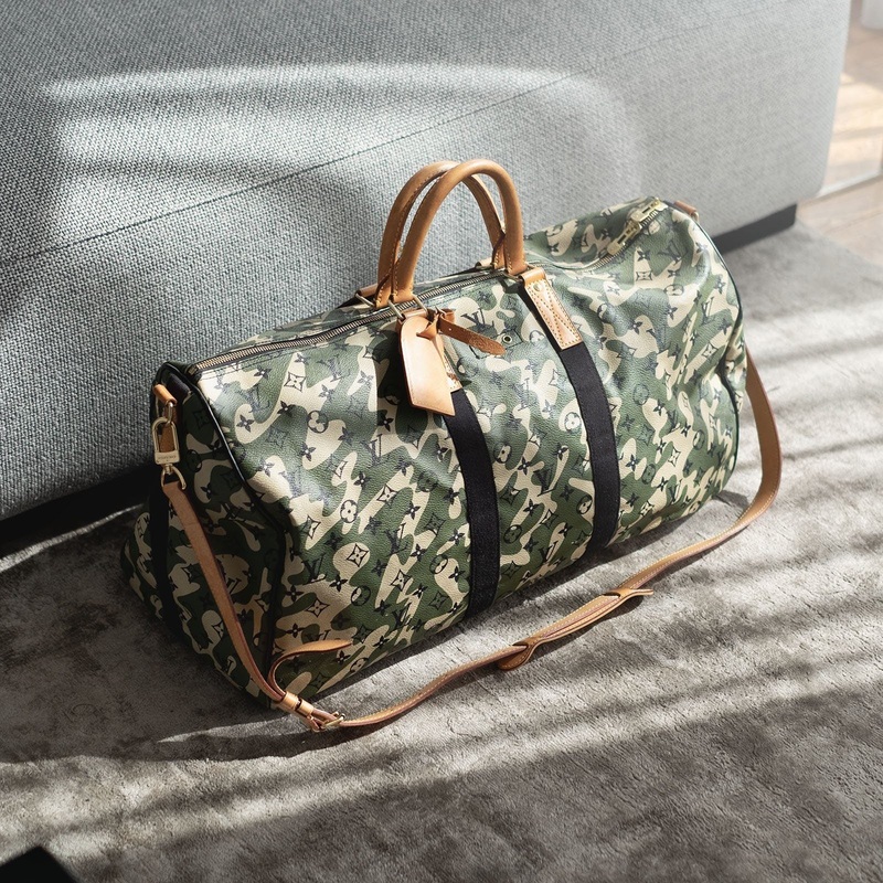 Vuitton, Murakami, Camouflage what’s not to like? As part of their ongoing collaboration, the luxury brand and the Japanese pop artist presented the Monogramouflage collection in 2008. Bringing the iconic LV Monogram pattern onto a two-toned camo base, Monogramouflage marks a fearless use of ‘disruptive pattern material’ within the world of luxury items and high fashion. This Keepall 55 bag is in its impeccable original state, with only the leather handles showing some fine patina from usage. An absolutely stunning and ultimately rare piece which we are proud to be featuring in our store.