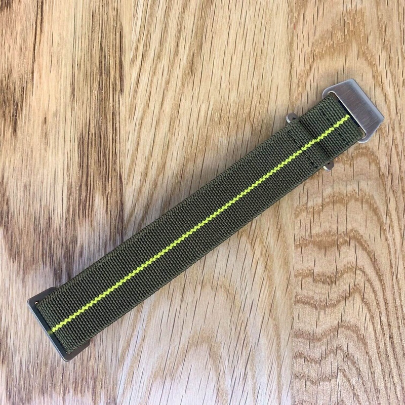 Soft. Lightweight. Durable. All characteristics that make this sensational Marine Nationale strap in Army Green and Yellow the ideal choice.