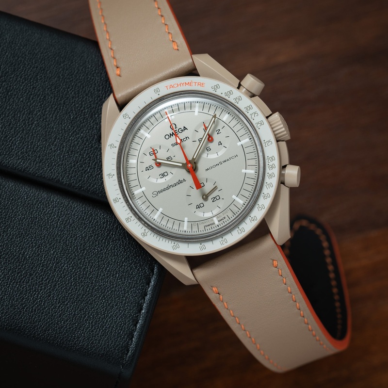 We’ve developed a total of 11 designs, curated to compliment each of the first 11 MoonSwatches, allowing the pairing to be seamless. These straps use the same leather and style from straps you love from Delugs, but with characteristics of two-tone accents in the stitching, edge paint and keepers.