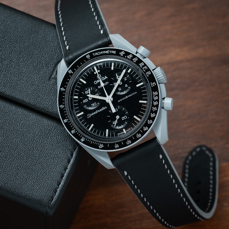 We’ve developed a total of 11 designs, curated to compliment each of the first 11 MoonSwatches, allowing the pairing to be seamless. These straps use the same leather and style from straps you love from Delugs, but with characteristics of two-tone accents in the stitching, edge paint and keepers.