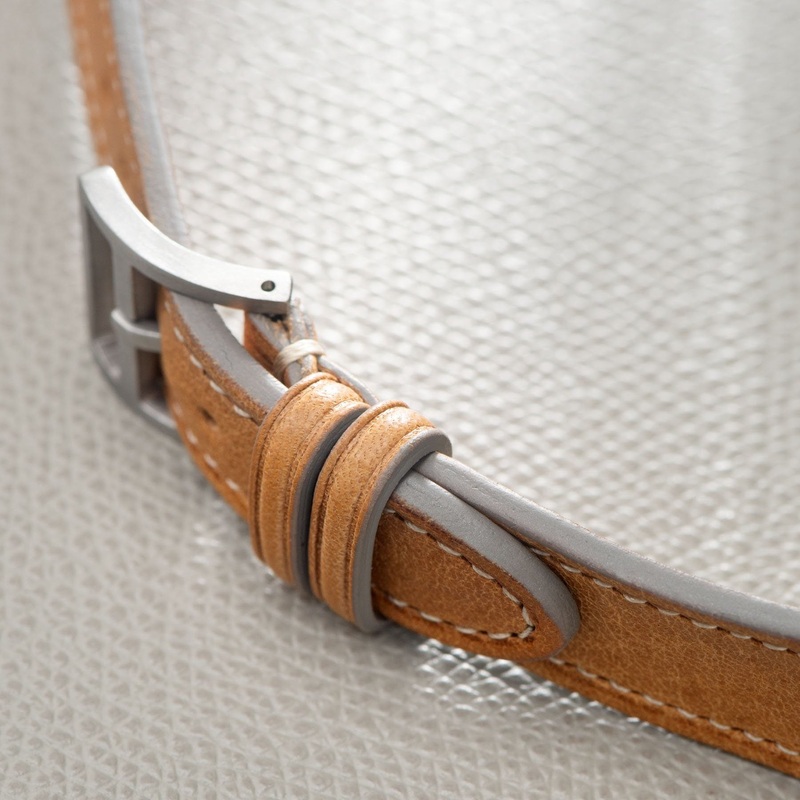 The light brown tones of the naturally tanned leather are countered by grey painted edges, giving this watch strap a relaxed, yet elegant mood that will fit many watches.