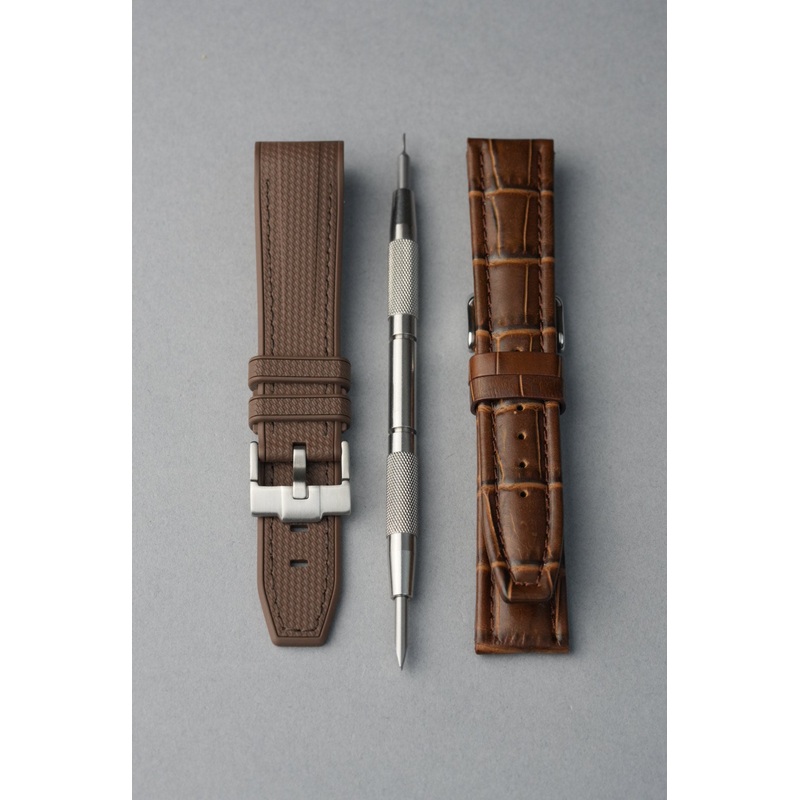 Two best-selling styles. One complete strap kit. This set brings together our two most popular designs, a rubber woven curved-end rubber divers strap and a classic straight-end leather strap, plus a spring bar tool for easy installation at home.