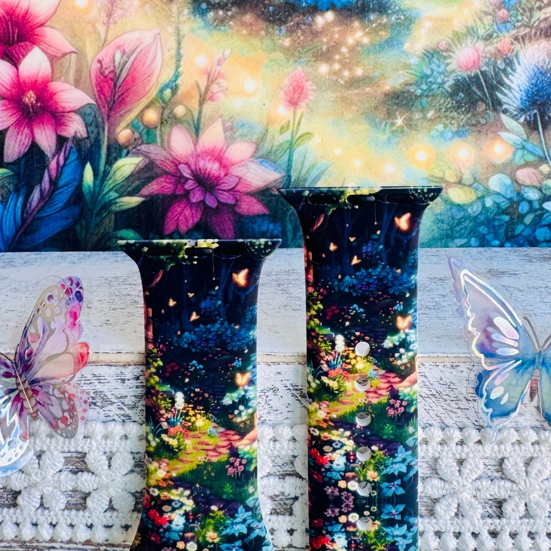 Step into the shimmer. Mystic Garden blooms across a deep midnight base with glowing florals, twinkling firefly specks, and a dreamy woodland path. The soft-touch silicone stays feather-light on your wrist, rinses clean in seconds, and adds a hint of wonder to everyday fitswhether youre lifting at the gym, running errands, or heading out for a night stroll.