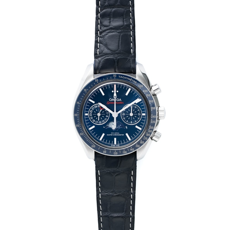 Its fitted on a blue leather strap with a polished-brushed foldover clasp. This Speedmaster Moonphase combines bold design, technical features, and prestige an excellent piece for sport and style.