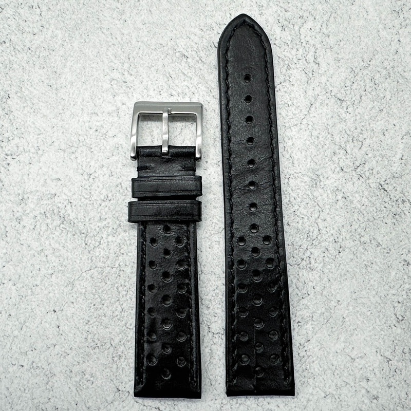Sporty. Stylish. Sophisticated. Elevate your watch with this Racing Style leather watch strap in Black. Its perforated cowhide design adds sporty sophistication, while ensuring breathable comfort for both casual and formal settings.