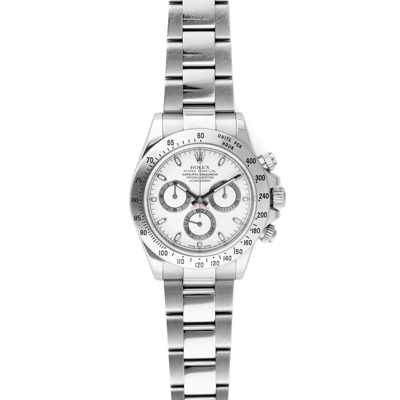 The 40 mm Oyster case is crafted in 904L Oystersteel, renowned for its toughness and polished finish. A fixed steel bezel engraved with a tachymetric scale highlights the Daytonas racing heritage, enabling measurement of average speeds. The case is water-resistant to 100 metres, with screw-down pushers and crown ensuring security.