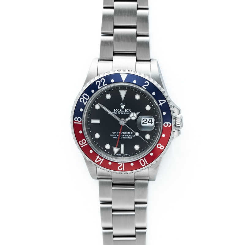 The defining feature of this model is its red and blue aluminium bezel insert, allowing the wearer to read a second time zone via the 24-hour hand. The bezel rotates bidirectionally with crisp precision, and its vibrant colours have made the Pepsi GMT one of the most collected Rolex designs in history.