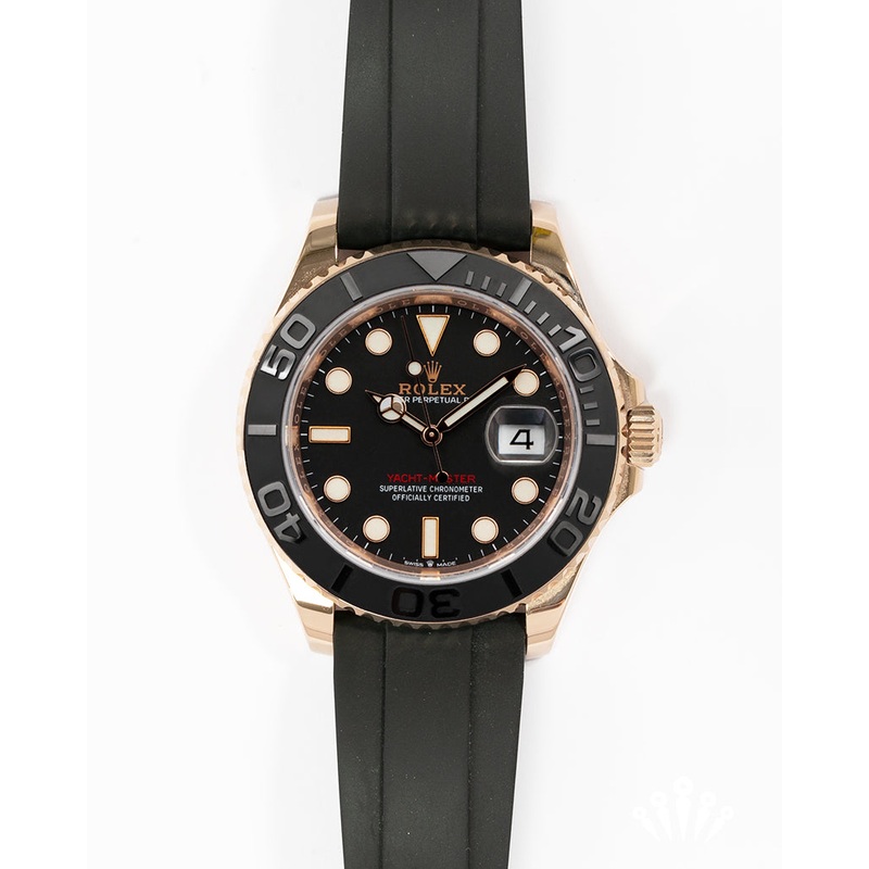 The Yacht-Masters new Oysterflex bracelet, developed by Rolex and patented, offers a sporty alternative to metal bracelets. The bracelet attaches to the watch case and the Oysterlock safety clasp by a flexible titanium and nickel alloy metal blade.