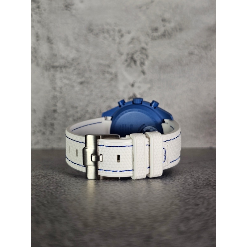 This White Rubber Curved Strap with White Stitching is a sleek upgrade for the Swatch x Omega MoonSwatch Mission to EarthPhase Moonshine Gold. The curved-end design ensures a smooth, integrated fit against the case, while the crisp white contrast stitching highlights the navy tones of the Moonshine Gold model.