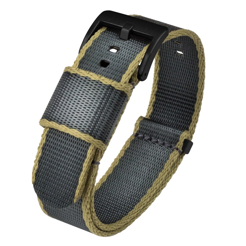 Our Jetson NATO style strap is the nylon watch band we love so much, we had to name it! Crafted from premium seat belt weave nylon with custom stitching and 316L surgical grade stainless steel, this slate grey NATO style strap with tan edges is waterproof, washable and fit for all occasions.